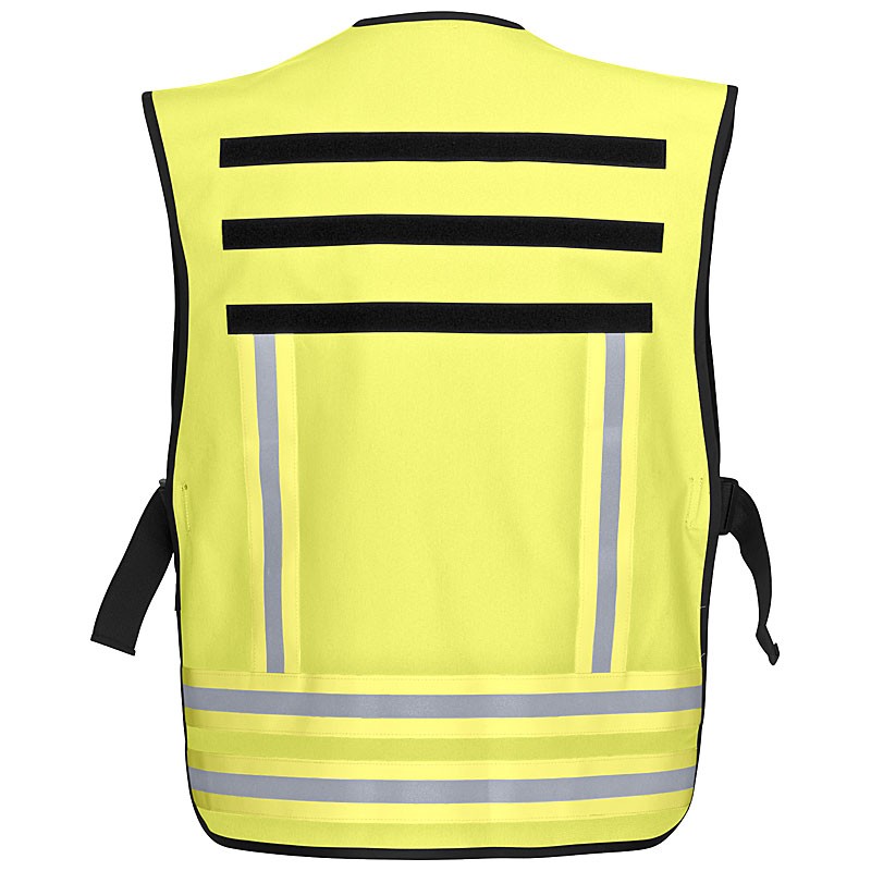 Feuerwehr Funktions- und Kennzeichnungsweste aus hochwertiger und fester 65% Baumwolle und 35% Polyester. Die Funktionsweste ist mit schwarzem Außenband eingefasst und hat 2 Seitentaschen mit Patte und Klett, 2 Funkgerätetaschen mit Patte und Klett, mittels Klett in der Tiefe verstellbar, jeweils mit Antennenschlaufe, durch Klettlasche zusätzlich zu sichern. Universalgröße XXL, seitlich durch elastisches Band mit Schnalle weitenverstellbar, vorn durch 2 Schnallen zu schließen. Original 3M™ Scotchlite™ Reflexband gelb/silber/gelb 2-fach am Jackensaum umlaufend sowie im Brust- und Rückenbereich je 2 Streifen senkrecht. Durch Verwendung von Flauschbändern flexibel für unterschiedliche Einsatzsituationen verwendbar. Flausch für 2 Reflexschilder 38x8cm auf dem Rücken sowie für ein Brustschild 15x5cm und ein Klettstreifen für Namensschilder in 130x25 mm auf der rechten Brustseite. Die Schilder sind nicht im Lieferumfang enthalten.