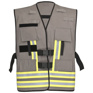 Feuerwehr / Rettungsdienst Funktions- und Kennzeichnungsweste aus hochwertiger und fester 65% Baumwolle und 35% Polyester. Die Funktionsweste ist mit schwarzem Außenband eingefasst und hat 2 Seitentaschen mit Patte und Klett, 2 Funkgerätetaschen mit Patte und Klett, mittels Klett in der Tiefe verstellbar, jeweils mit Antennenschlaufe, durch Klettlasche zusätzlich zu sichern. Universalgröße XXL, seitlich durch elastisches Band mit Schnalle weitenverstellbar, vorn durch 2 Schnallen zu schließen. Original 3M™ Scotchlite™ Reflexband gelb/silber/gelb 2-fach am Jackensaum umlaufend sowie im Brust- und Rückenbereich je 2 Streifen senkrecht. Durch Verwendung von Flauschbändern flexibel für unterschiedliche Einsatzsituationen verwendbar. Flausch für 2 Reflexschilder 38x8cm auf dem Rücken sowie für ein Brustschild 15x5cm und ein Klettstreifen für Namensschilder in 130x25 mm auf der rechten Brustseite. Die Schilder sind nicht im Lieferumfang enthalten.