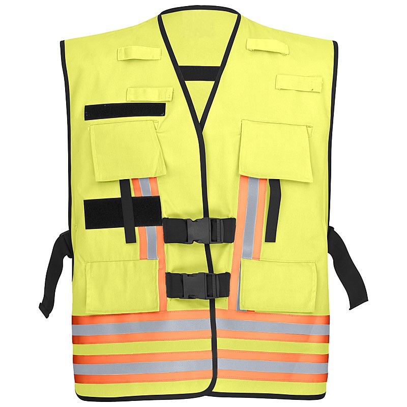 Feuerwehr Funktions- und Kennzeichnungsweste aus hochwertiger und fester 65% Baumwolle und 35% Polyester. Die Funktionsweste ist mit schwarzem Außenband eingefasst und hat 2 Seitentaschen mit Patte und Klett, 2 Funkgerätetaschen mit Patte und Klett, mittels Klett in der Tiefe verstellbar, jeweils mit Antennenschlaufe, durch Klettlasche zusätzlich zu sichern. Universalgröße XXL, seitlich durch elastisches Band mit Schnalle weitenverstellbar, vorn durch 2 Schnallen zu schließen. Original 3M™ Scotchlite™ Reflexband rot/silber/rot 2-fach am Jackensaum umlaufend sowie im Brust- und Rückenbereich je 2 Streifen senkrecht. Durch Verwendung von Flauschbändern flexibel für unterschiedliche Einsatzsituationen verwendbar. Flausch für 2 Reflexschilder 38x8cm auf dem Rücken sowie für ein Brustschild 15x5cm und ein Klettstreifen für Namensschilder in 130x25 mm auf der rechten Brustseite. Die Schilder sind nicht im Lieferumfang enthalten.