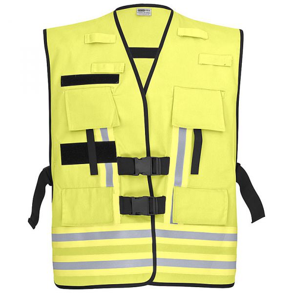 Feuerwehr Funktions- und Kennzeichnungsweste aus hochwertiger und fester 65% Baumwolle und 35% Polyester. Die Funktionsweste ist mit schwarzem Außenband eingefasst und hat 2 Seitentaschen mit Patte und Klett, 2 Funkgerätetaschen mit Patte und Klett, mittels Klett in der Tiefe verstellbar, jeweils mit Antennenschlaufe, durch Klettlasche zusätzlich zu sichern. Universalgröße XXL, seitlich durch elastisches Band mit Schnalle weitenverstellbar, vorn durch 2 Schnallen zu schließen. Original 3M™ Scotchlite™ Reflexband gelb/silber/gelb 2-fach am Jackensaum umlaufend sowie im Brust- und Rückenbereich je 2 Streifen senkrecht. Durch Verwendung von Flauschbändern flexibel für unterschiedliche Einsatzsituationen verwendbar. Flausch für 2 Reflexschilder 38x8cm auf dem Rücken sowie für ein Brustschild 15x5cm und ein Klettstreifen für Namensschilder in 130x25 mm auf der rechten Brustseite. Die Schilder sind nicht im Lieferumfang enthalten.